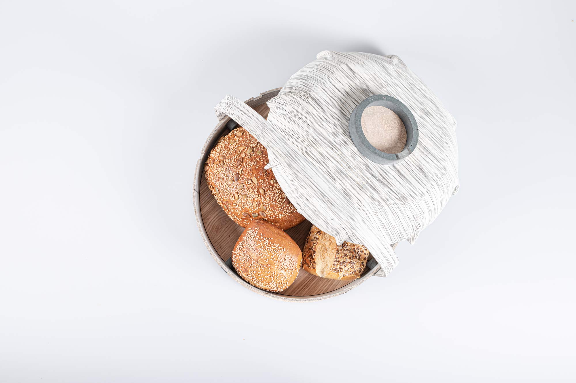 The bread box N.O.S.W. consists of a 3D veneer of the rattan palm (karuun®), stone joints and a cutting board. It can be used to purchase, store, prepare and serve bakery products.