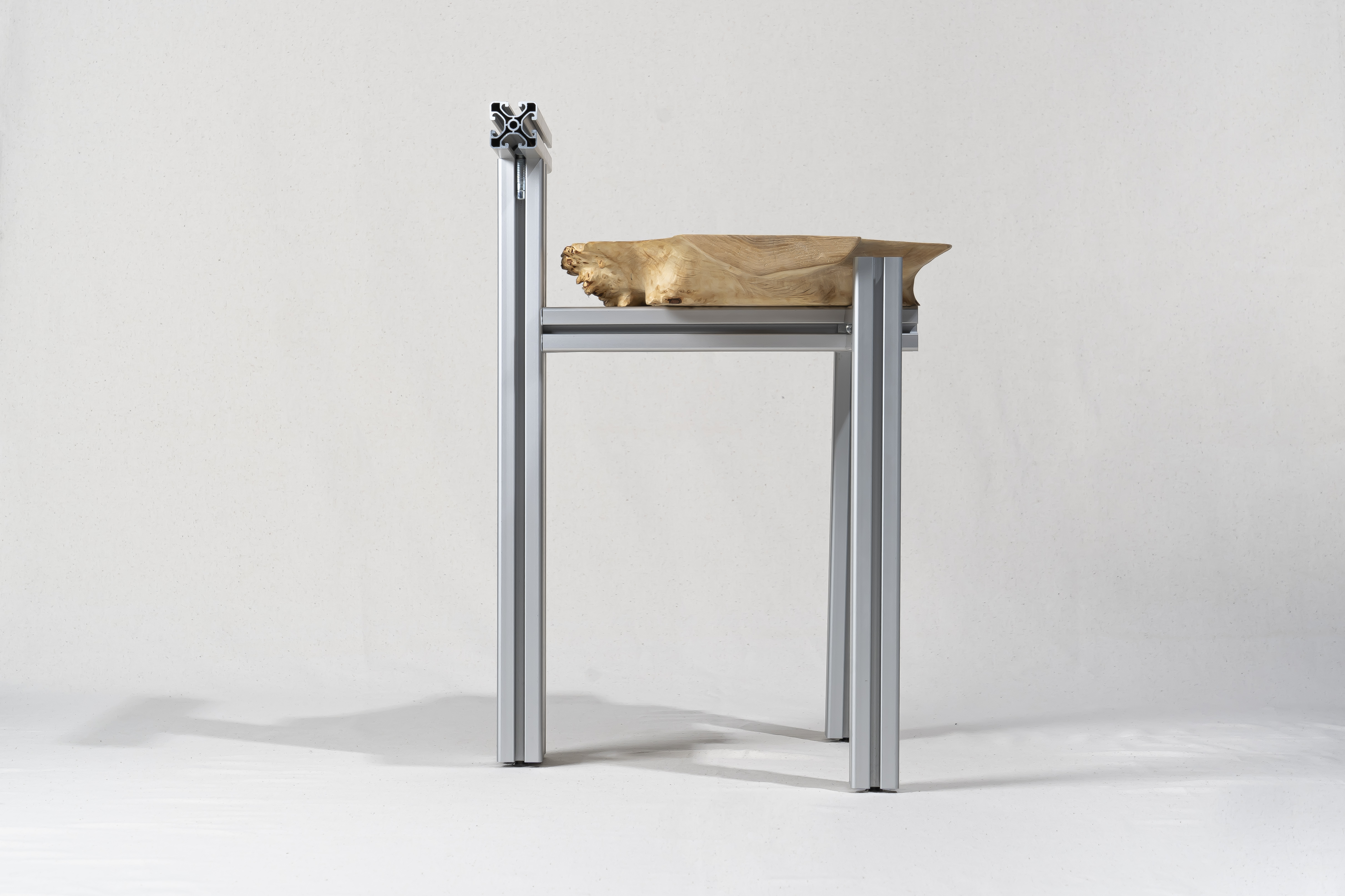 The starting point is the subsequent manual processing to reveal the individual beauty of the unique woods. The aluminium profile system allows creating extremely individualized structures.The goal is to bring opposites together, generate new forms of design and find a direct, unique aesthetic.